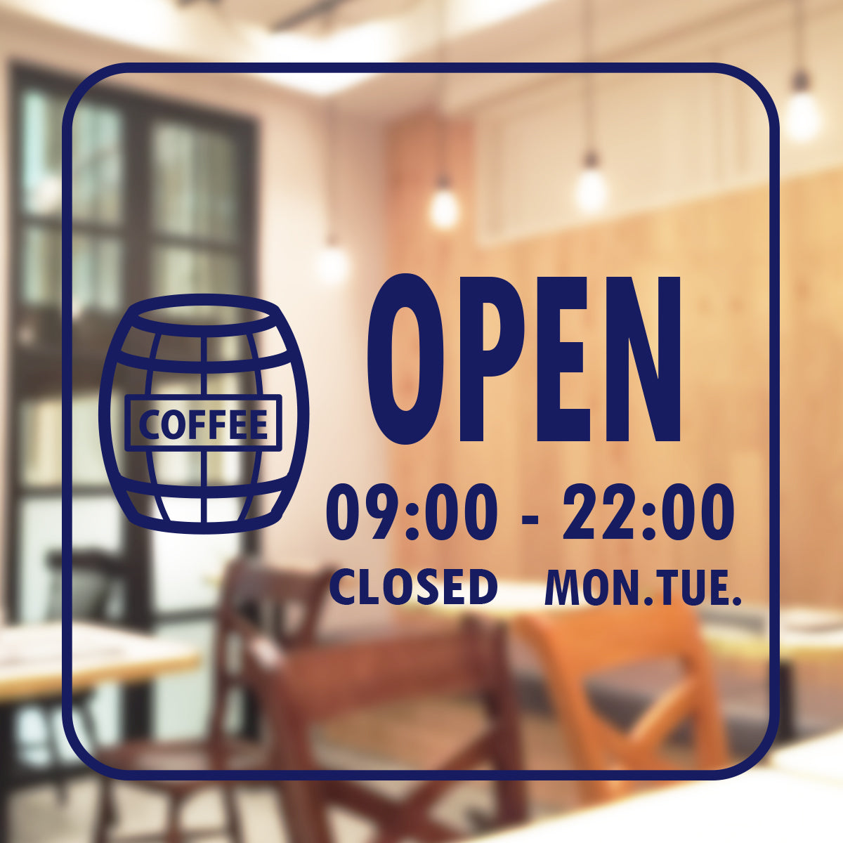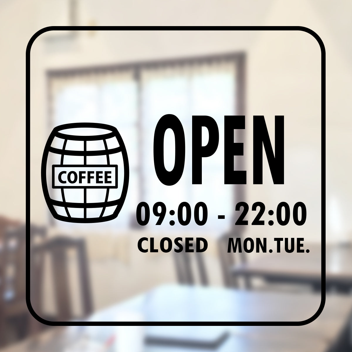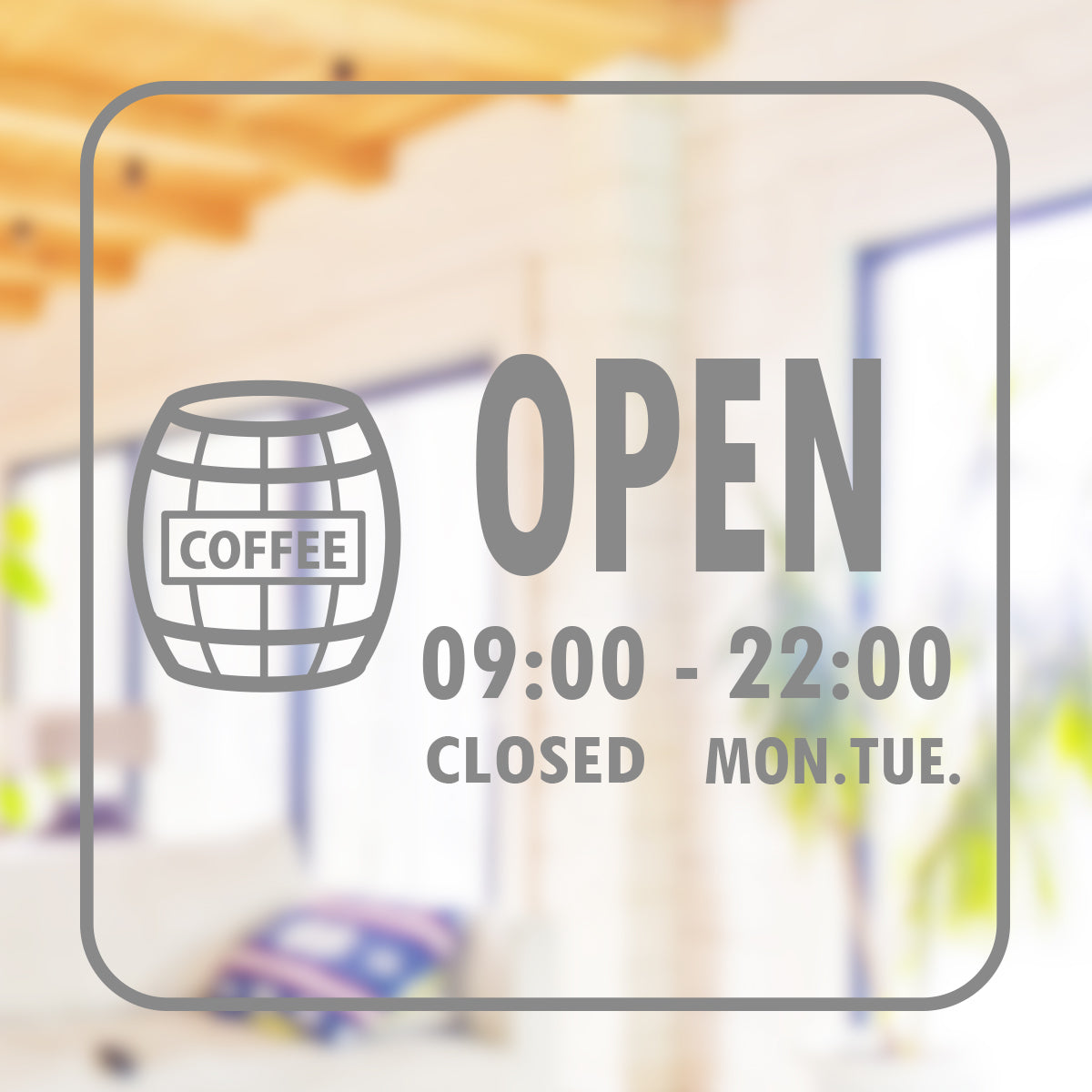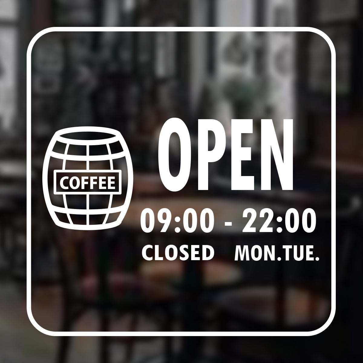 コーヒー樽デザインのステッカーで、カフェやレストランなどの施設の入り口などに貼り付けることで、簡潔に営業時間を案内することができます。