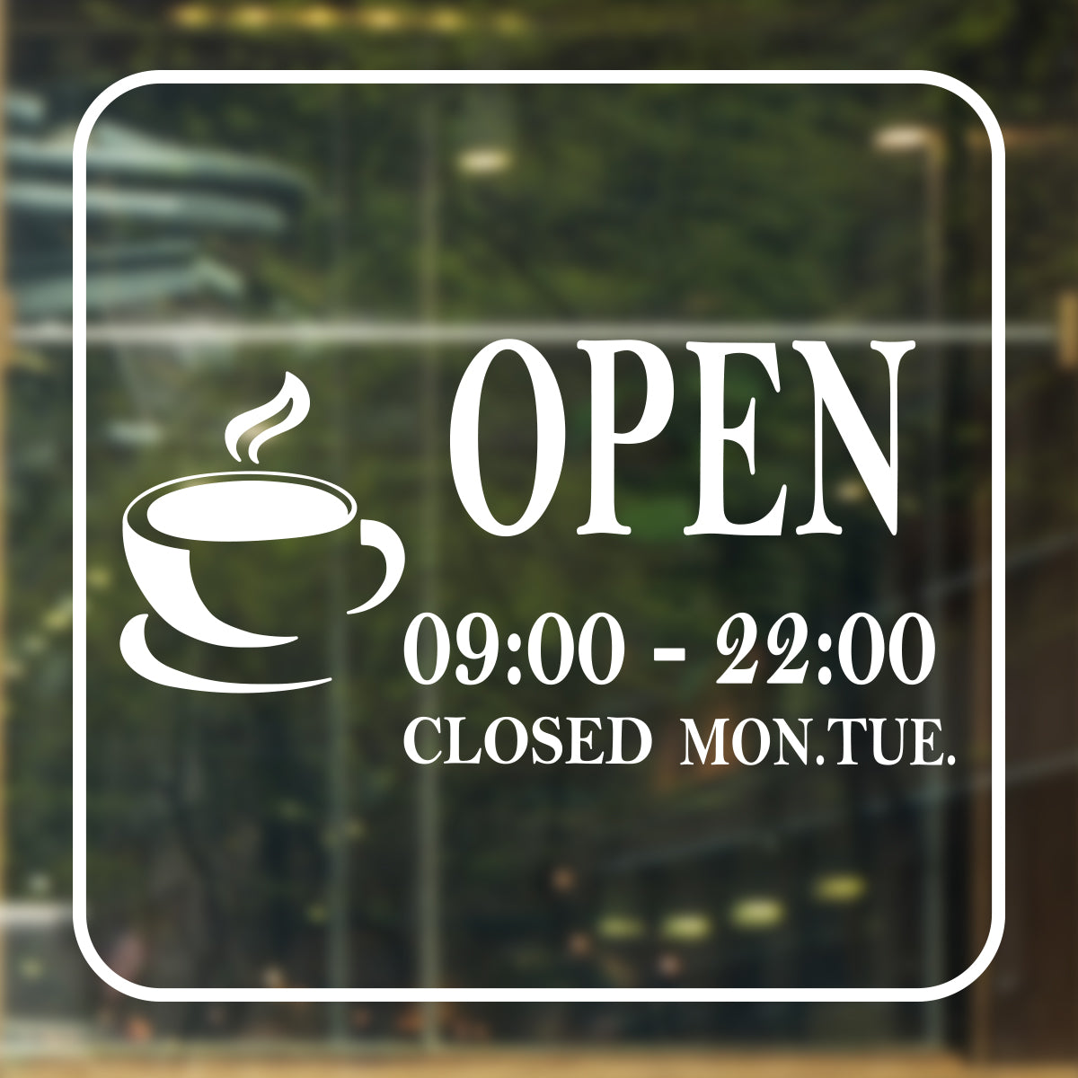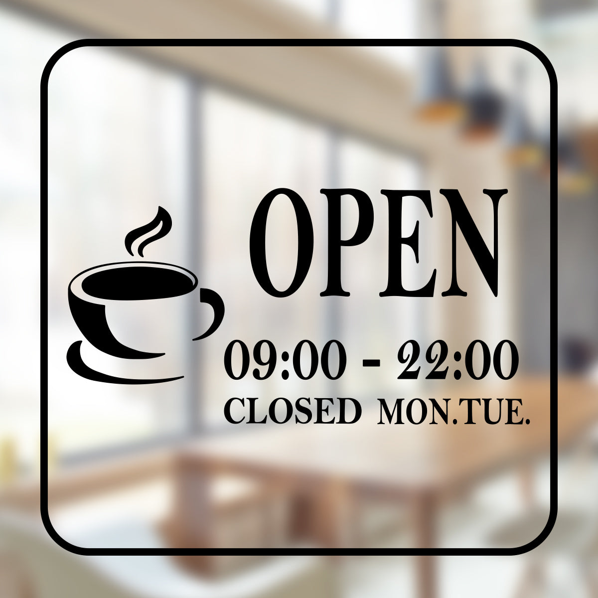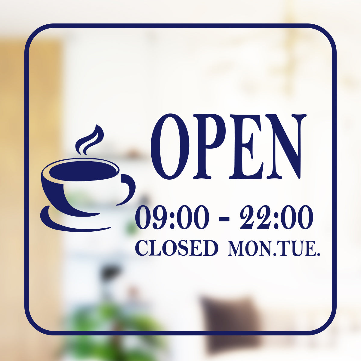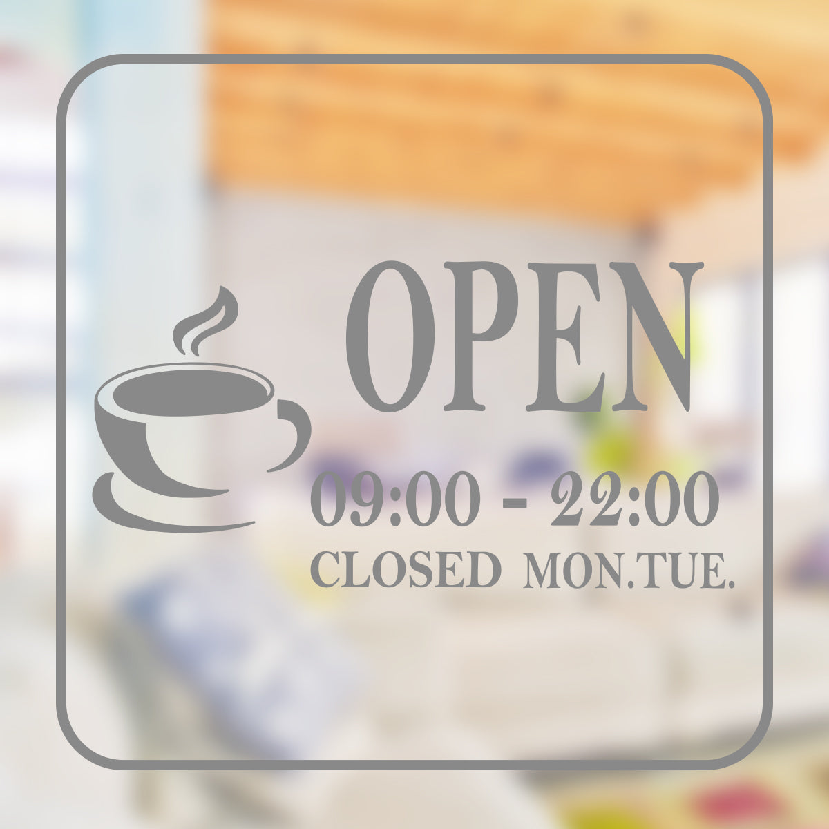 コーヒーカップをデザインしたスタイリッシュな営業時間ステッカーです。